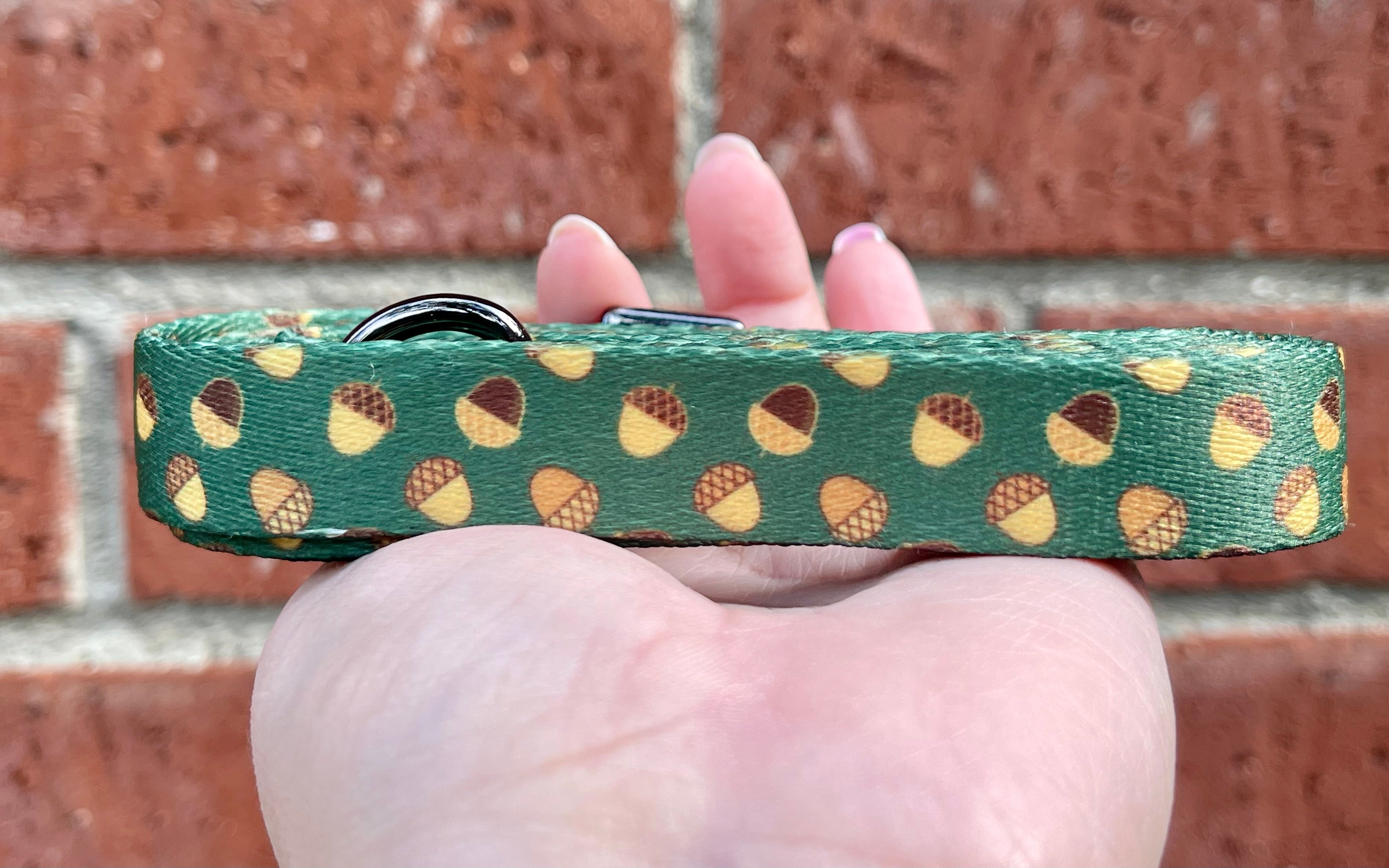 Our Acorn Dog Leash features a cozy green background sprinkled with golden acorns - a sweet, nature-inspired design made for crisp mornings, crunchy leaves, and pups who love exploring the great outdoors.