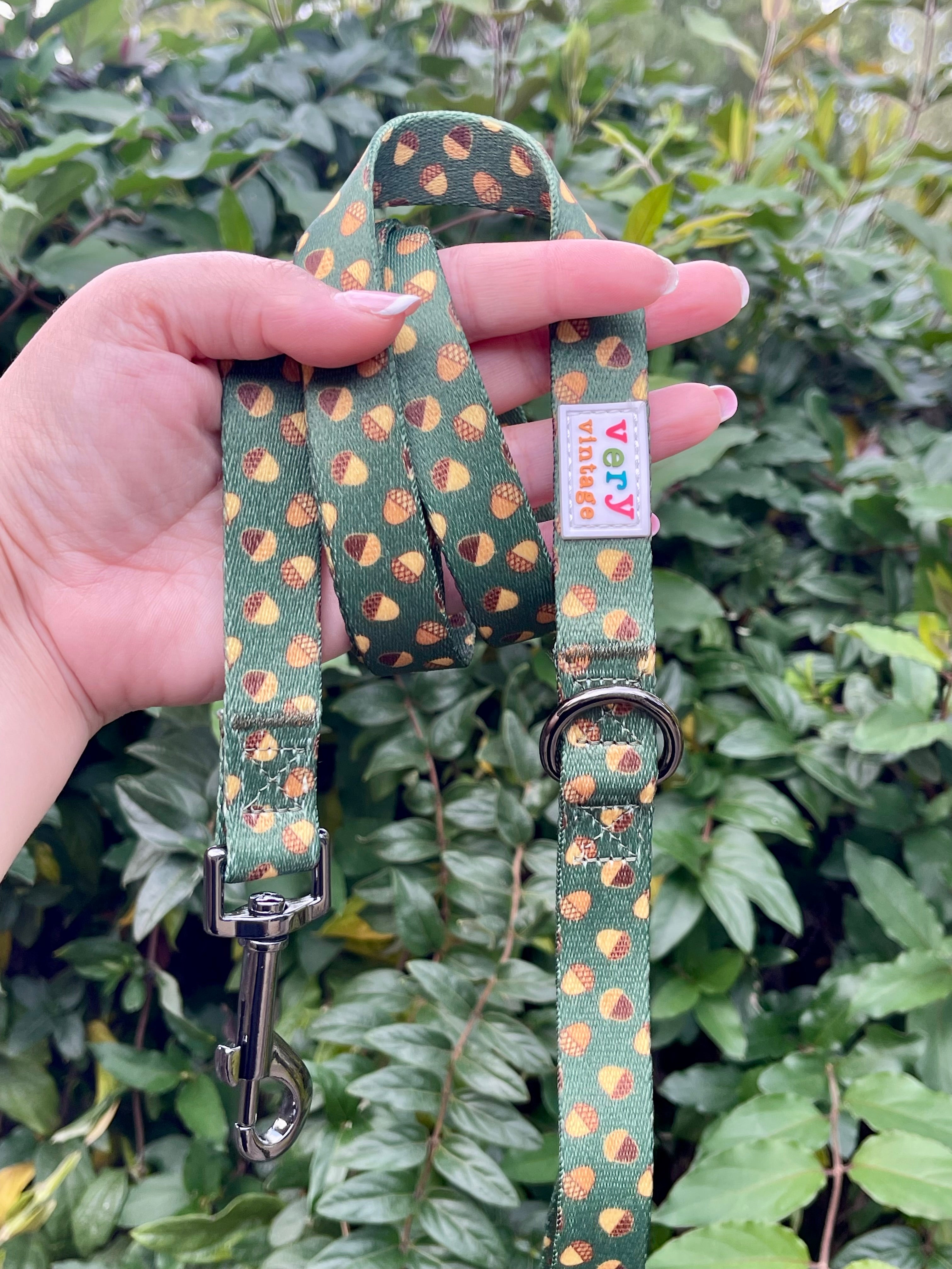 🍂 Whimsical acorn print on rich green background ♻️ Made from eco-friendly recycled nylon 🖤 Durable black metal clip and D-ring 🐶 Lightweight yet strong — ideal for everyday walks 🎀 Matching collar, harness & poop bag holder available 🌞 Lovingly designed in sunny California