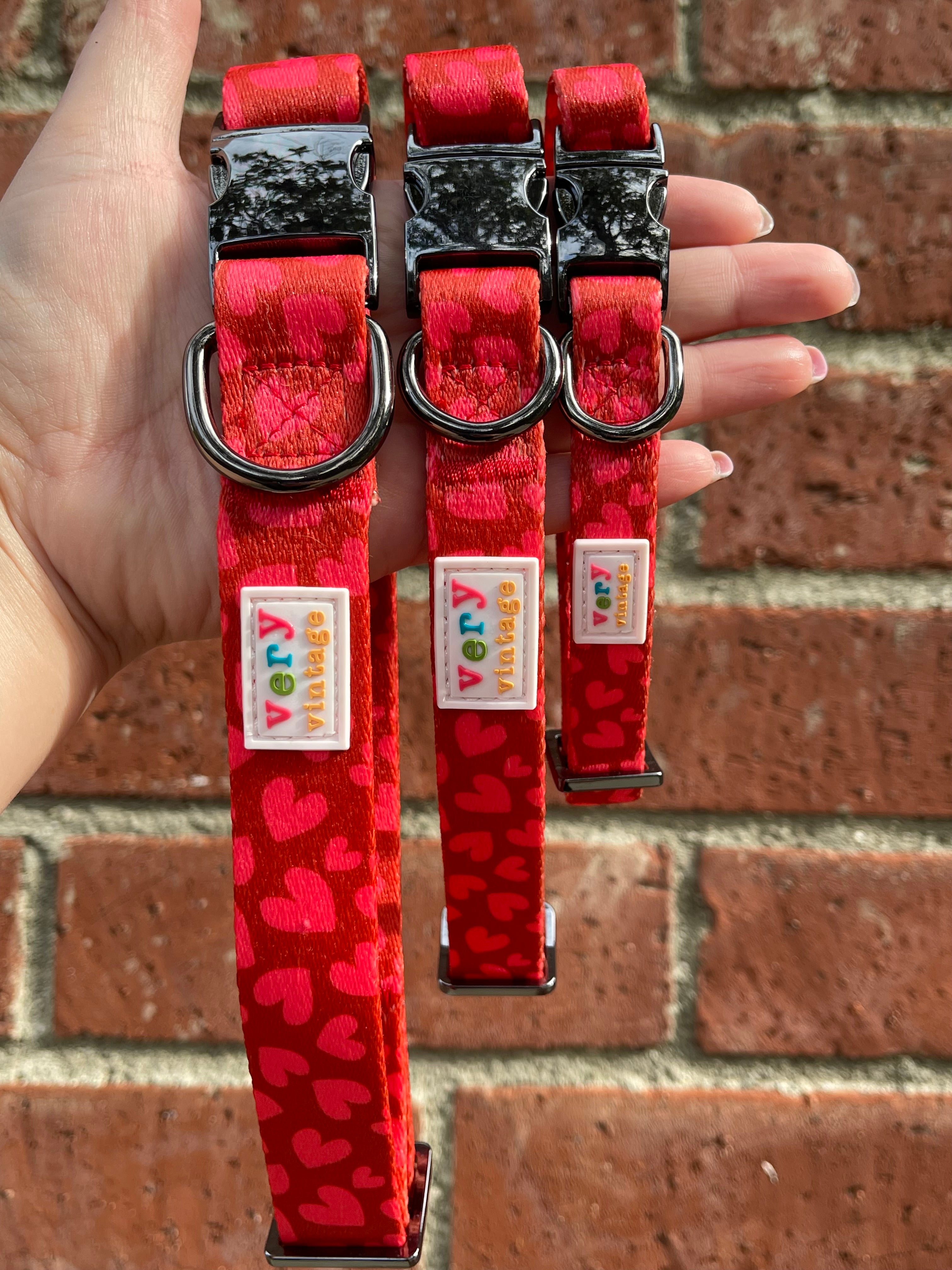 Featuring a rich red background sprinkled with playful heart shapes, this cheerful design is perfect for Valentine’s Day, date-night walks, or everyday pups who wear their hearts on their collars.