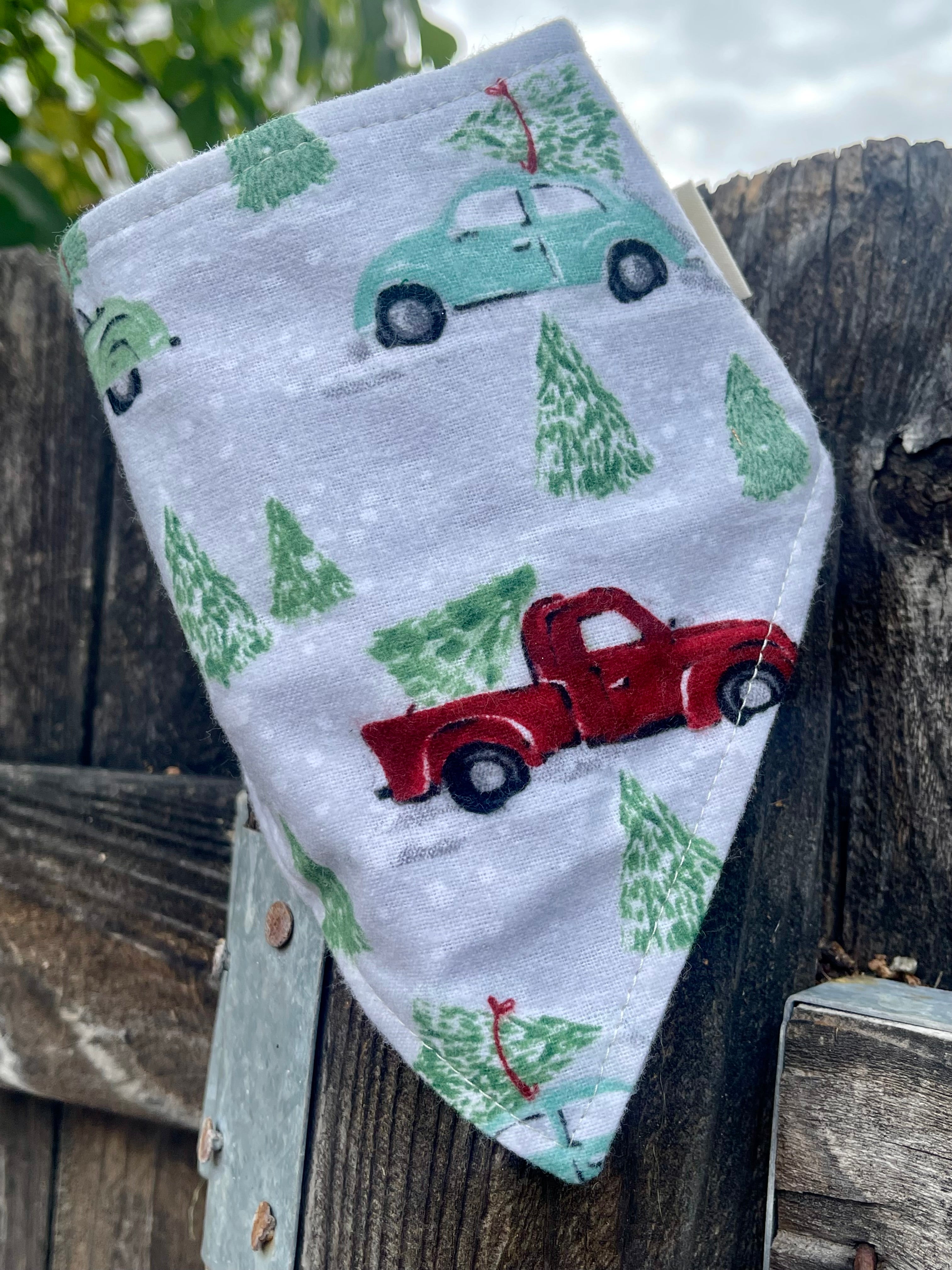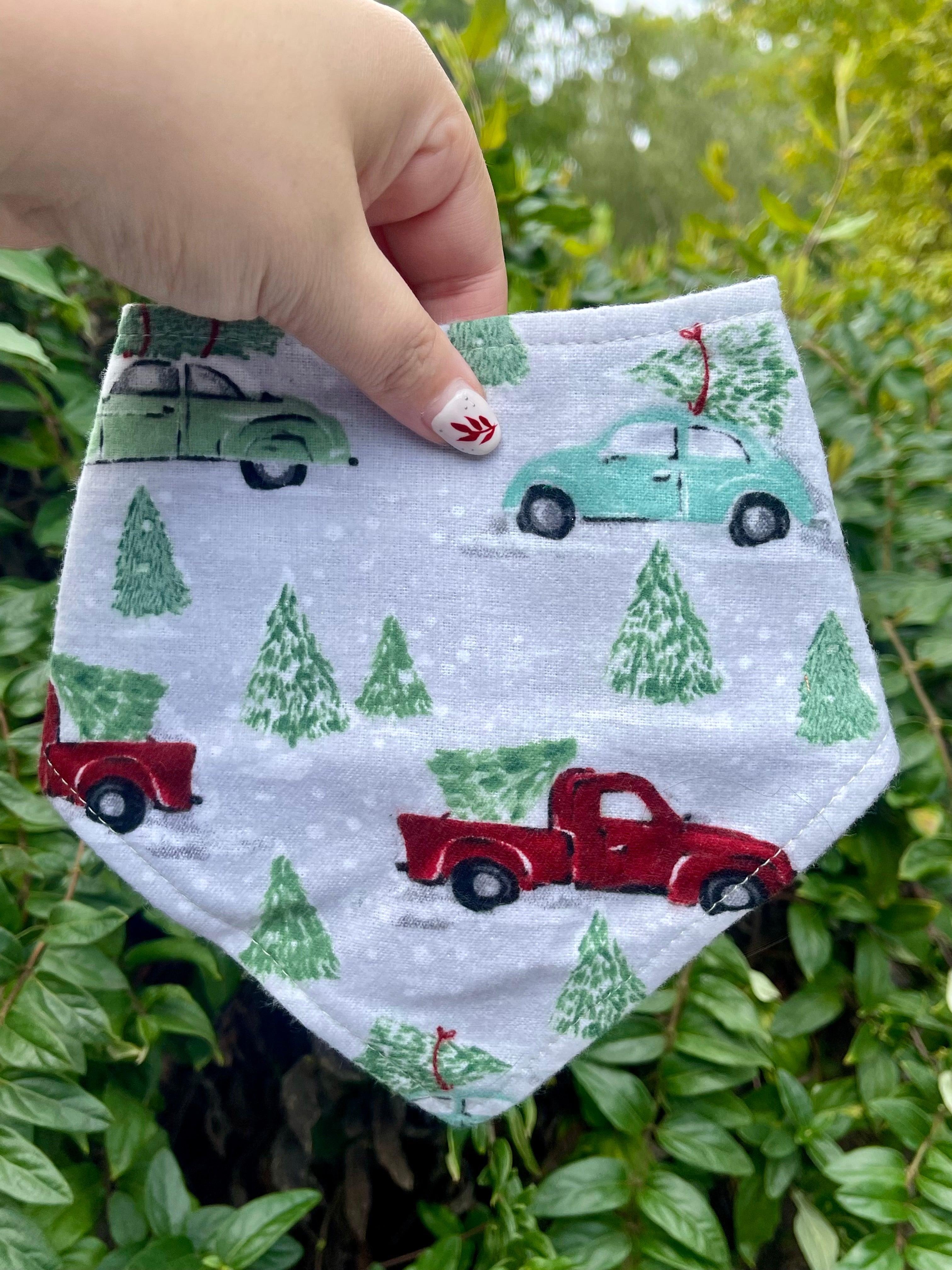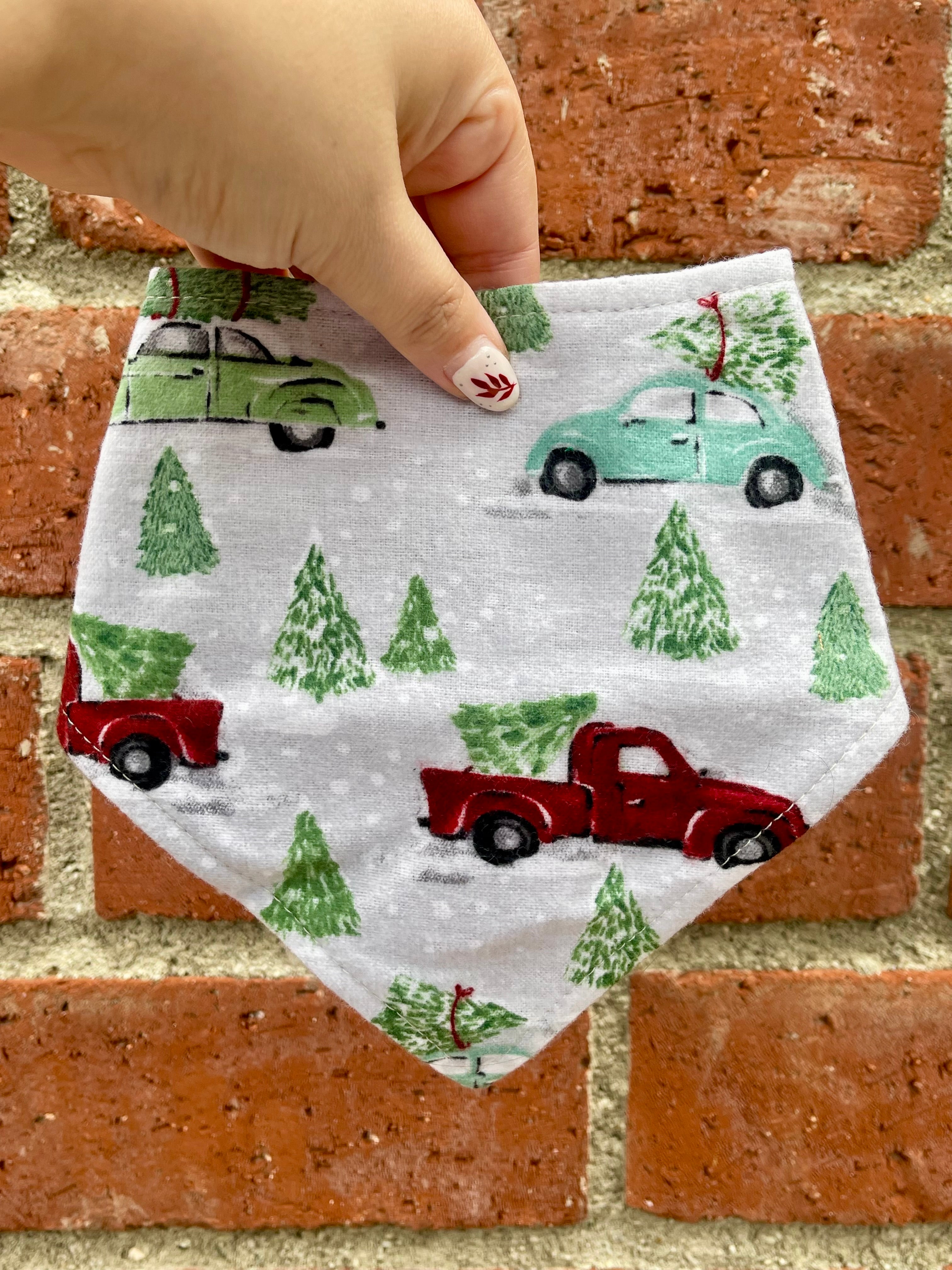 Cruisinโ into Christmas like๐๐ Our Christmas Tree Farm bandana features retro red trucks and pastel cars hauling home pine trees across a snowy landscape. Itโs a nostalgic nod to holiday traditions - and your pup gets to ride along in style!