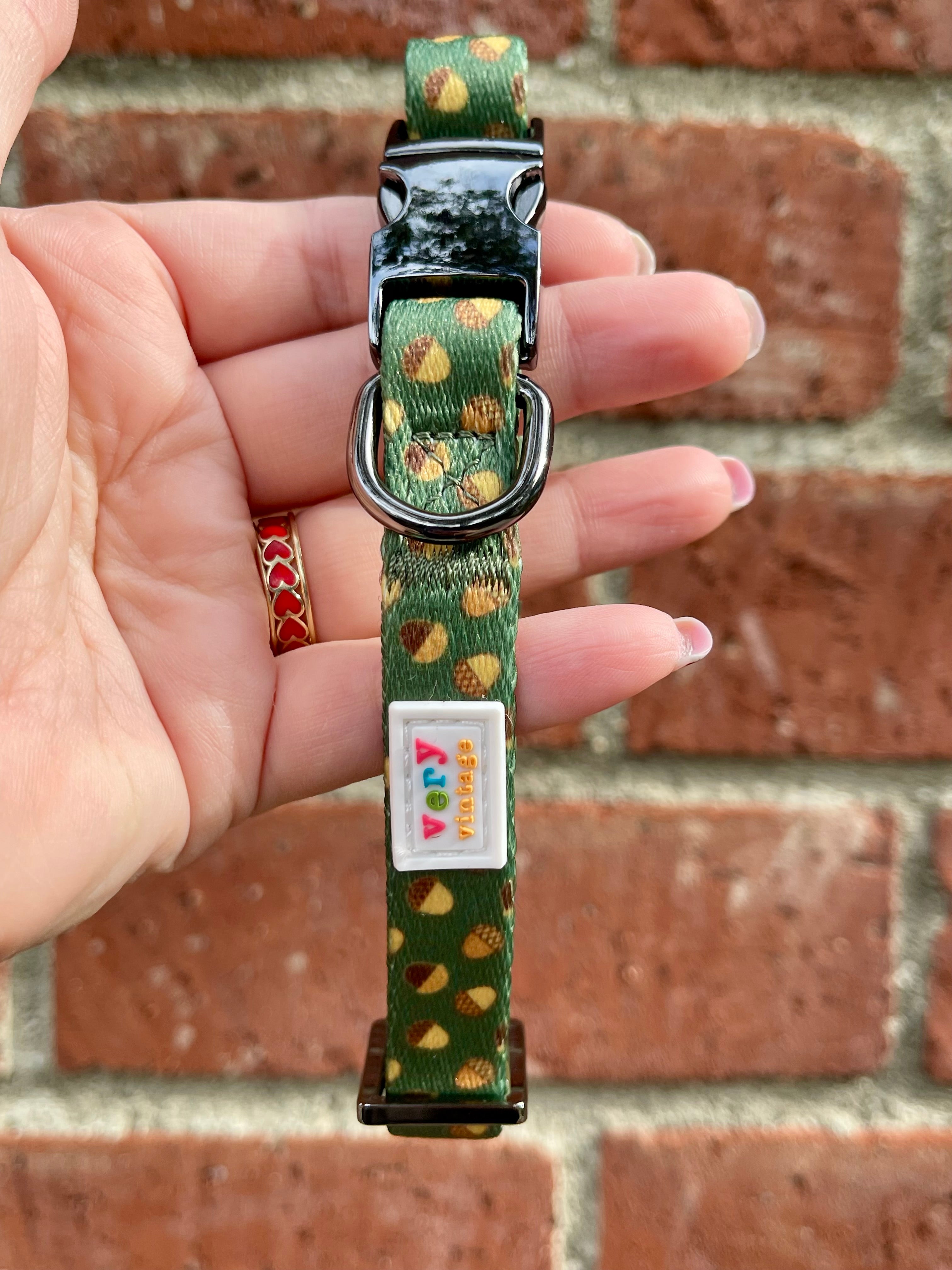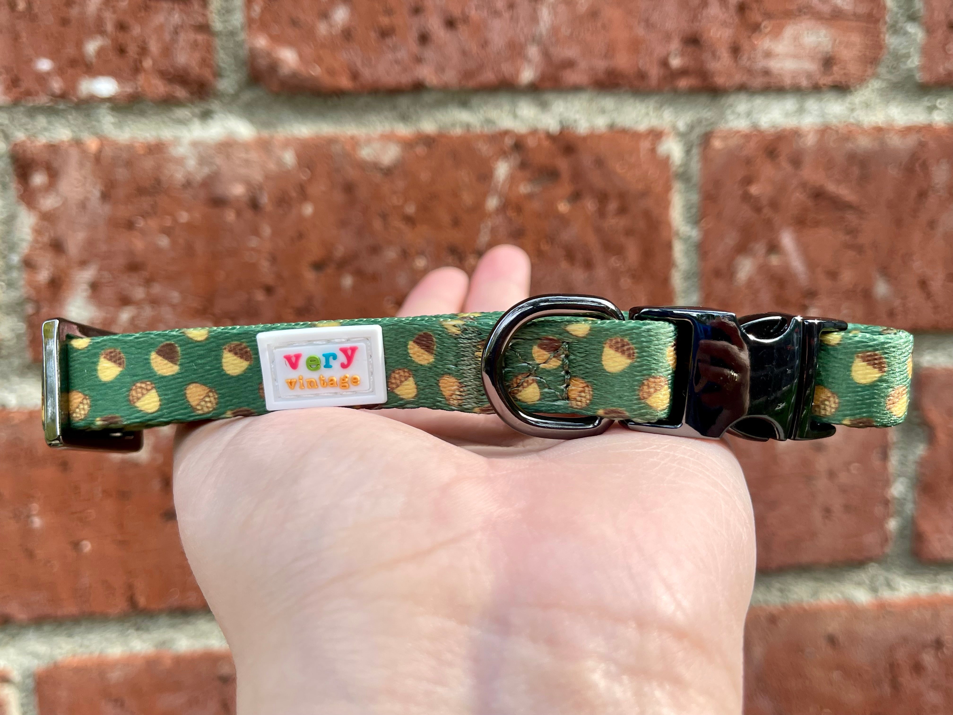 Featuring a rich green background sprinkled with sweet acorn details, this nature-inspired design is perfect for fall lovers, forest walks, and pups with cottagecore energy year-round.