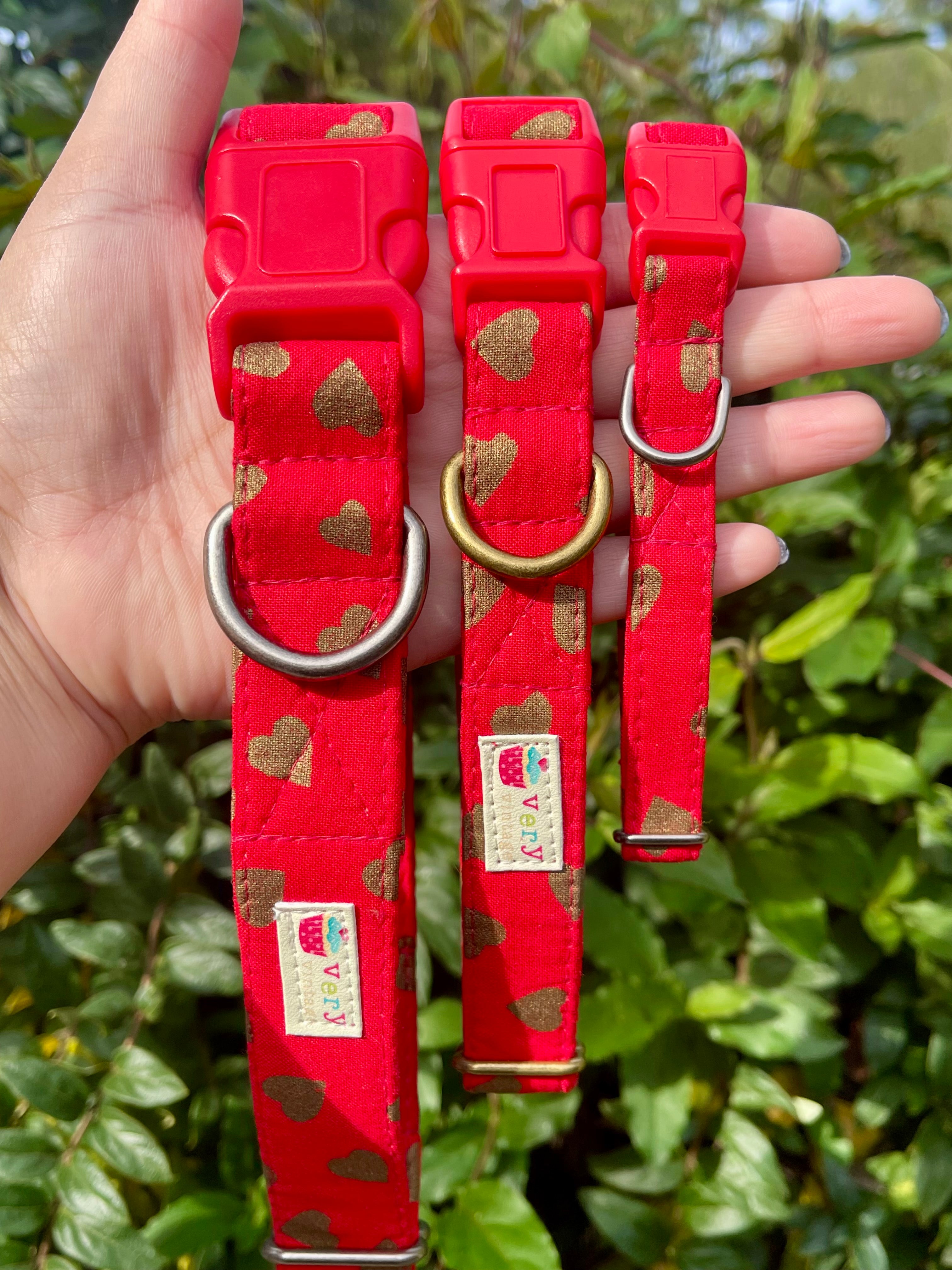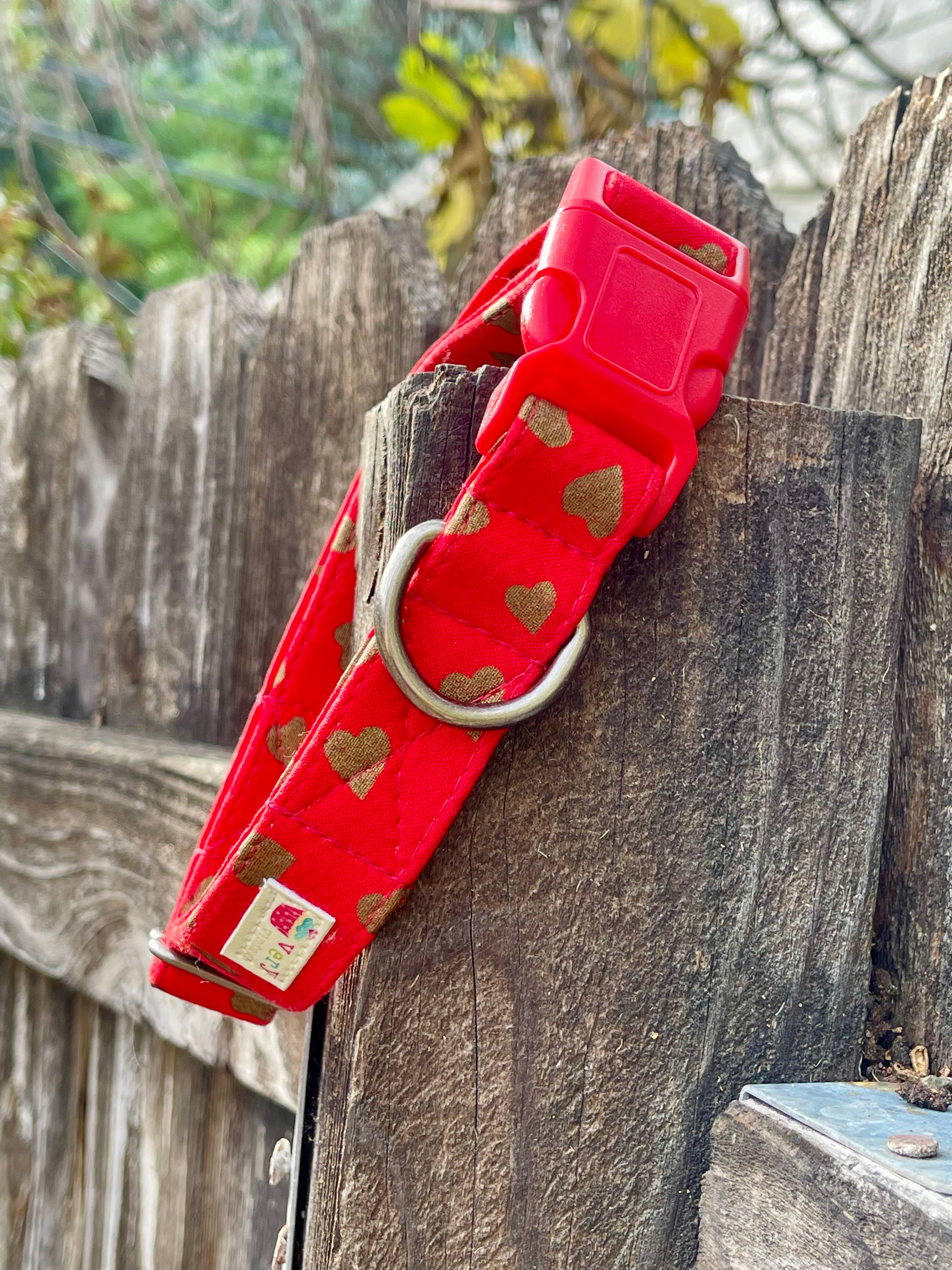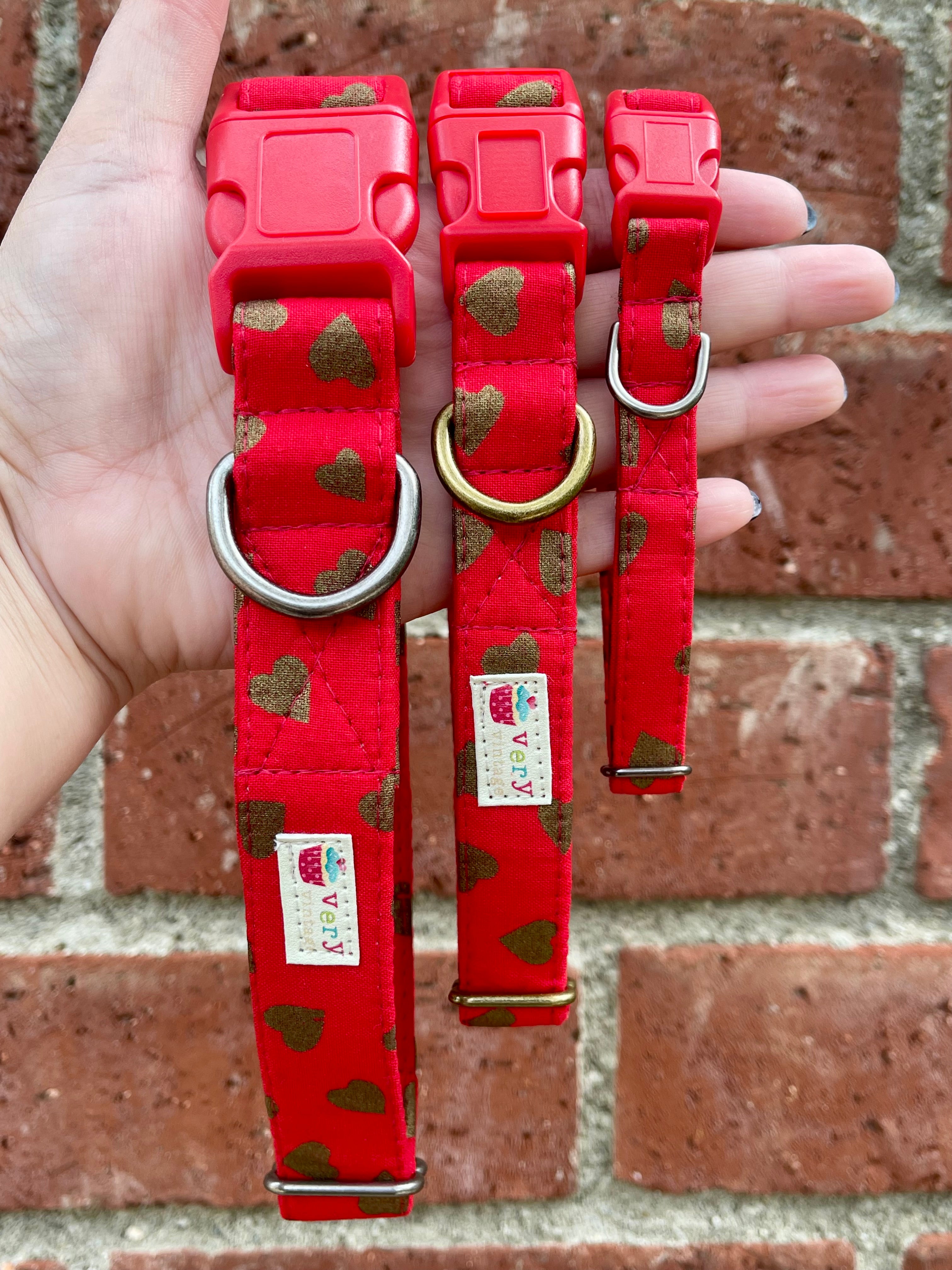 💖 What Makes It Special: 🧵 100% cotton fabric on eco-friendly organic cotton webbing ❤️ Rich red heart print with warm golden accents 🔴 Bright red buckle + choice of antique brass or antique silver hardware 📏 Adjustable sizing for the perfect fit 🪡 Reinforced box stitching for long-lasting durability 🧼 Machine washable – cold wash, mesh bag recommended 🌎 Handmade in California with love 🐱 Cat collars come with a safety breakaway buckle