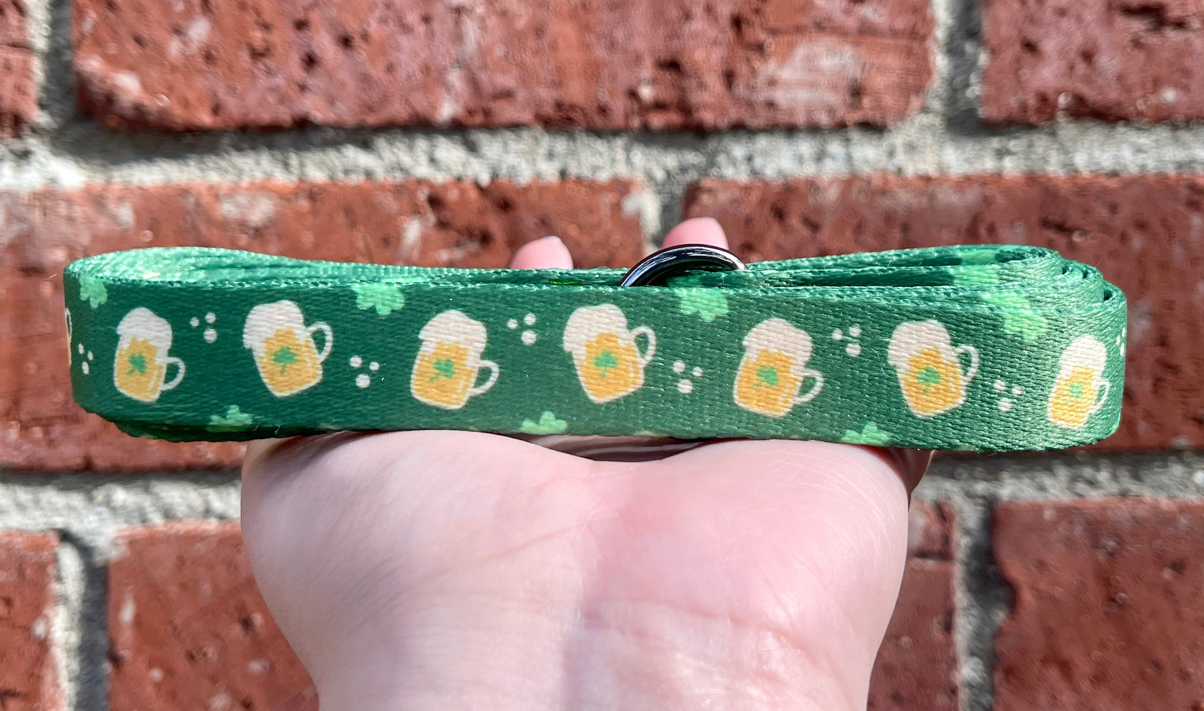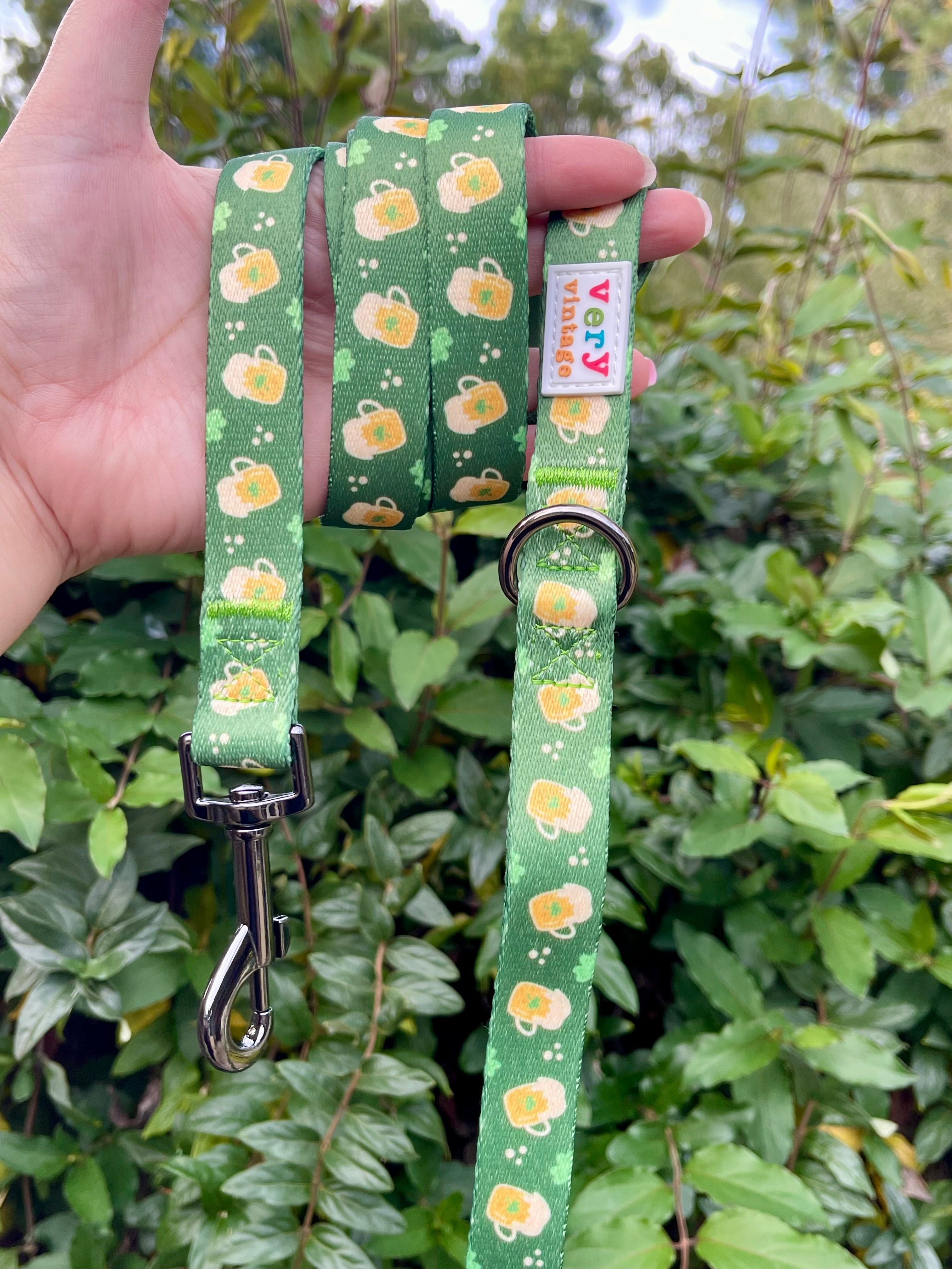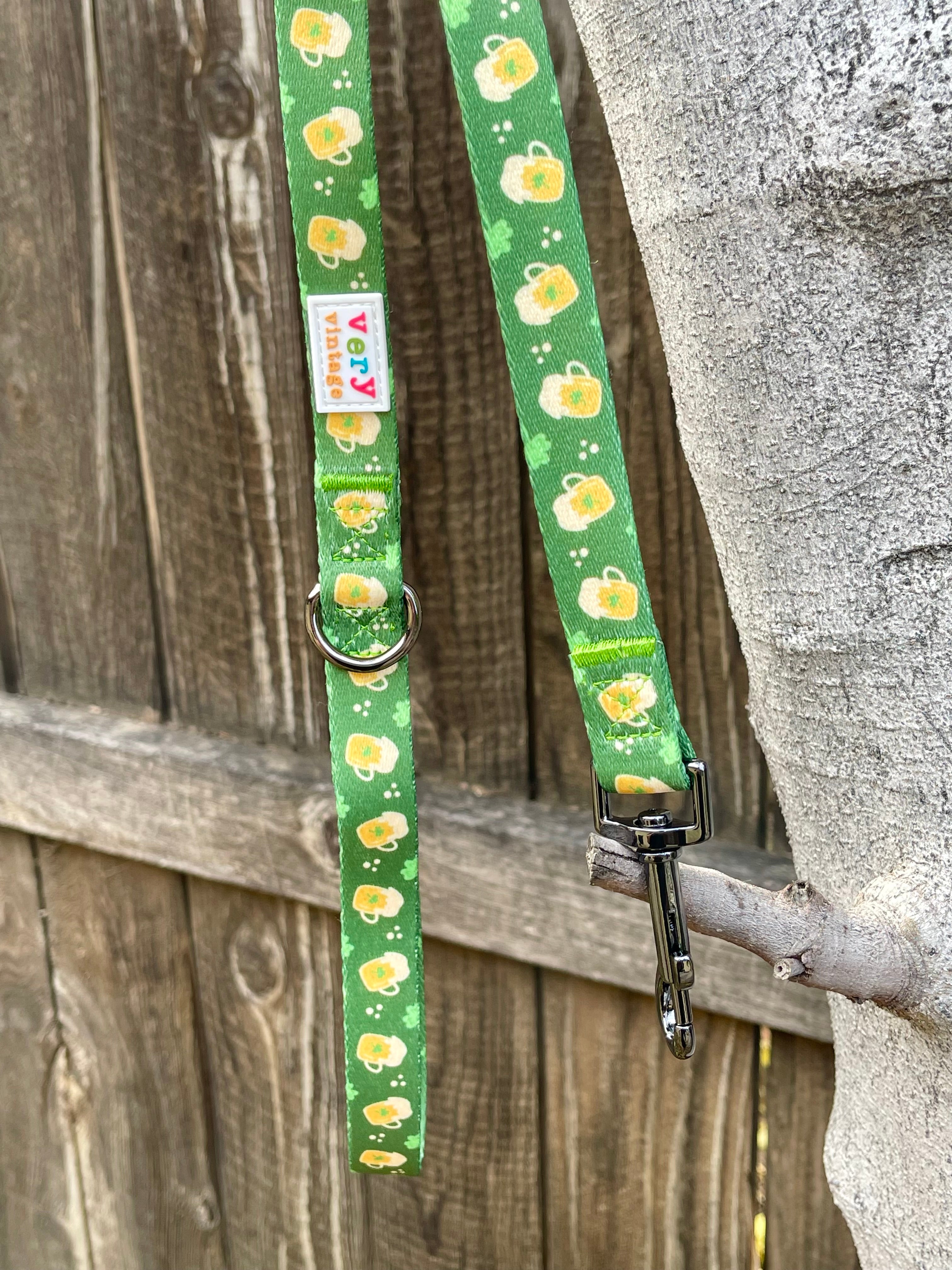 💖 What Makes It Special: 🍺 Playful Irish beer mug and shamrock print ♻️ Soft, eco-friendly recycled nylon for comfortable handling 🖤 Durable black metal clip and D-ring for added security 🐶 Lightweight design – easy to carry, strong enough for daily use 🎀 Matching collar, harness, and poop bag holder available 🌞 Lovingly designed in sunny California