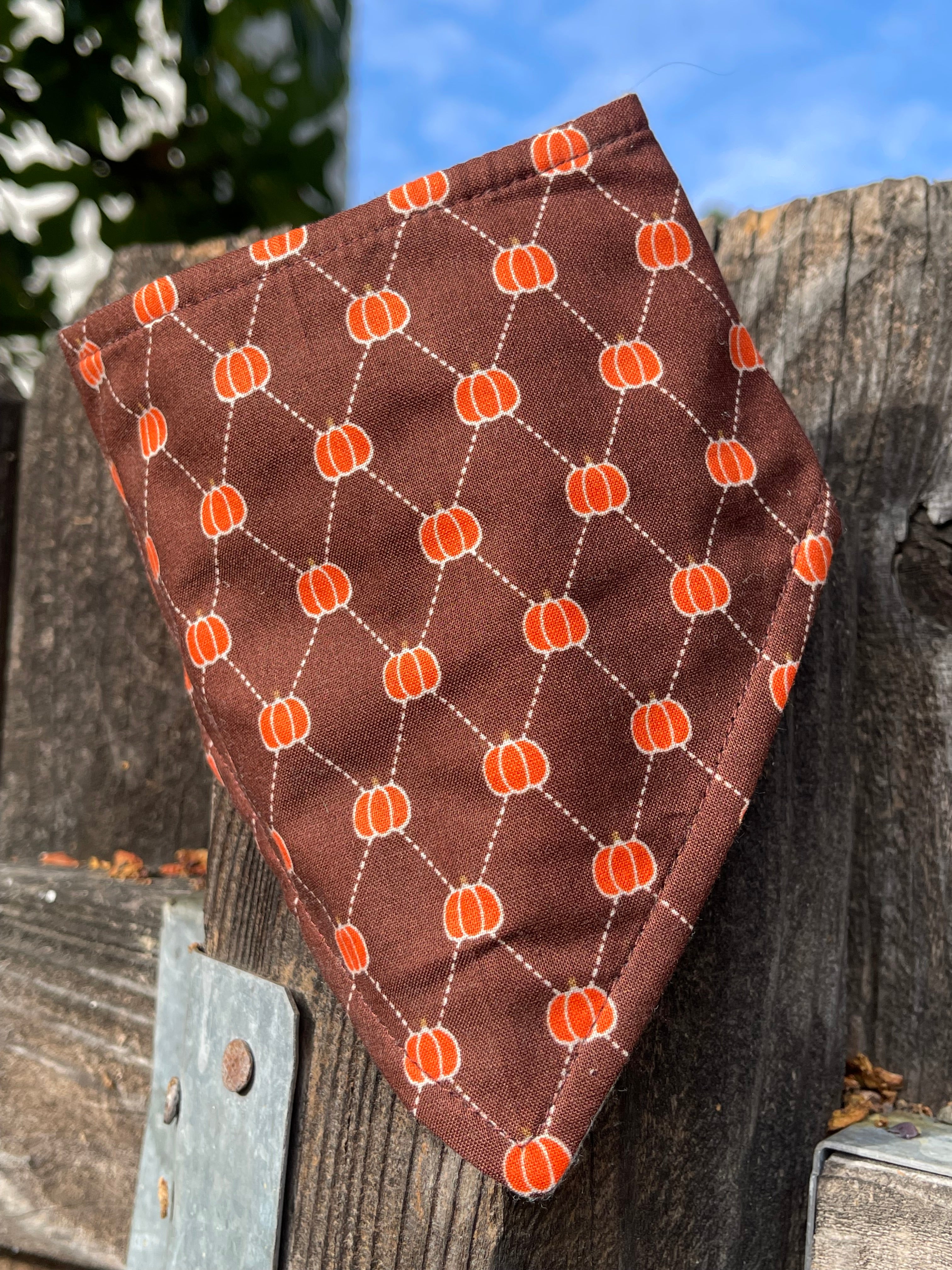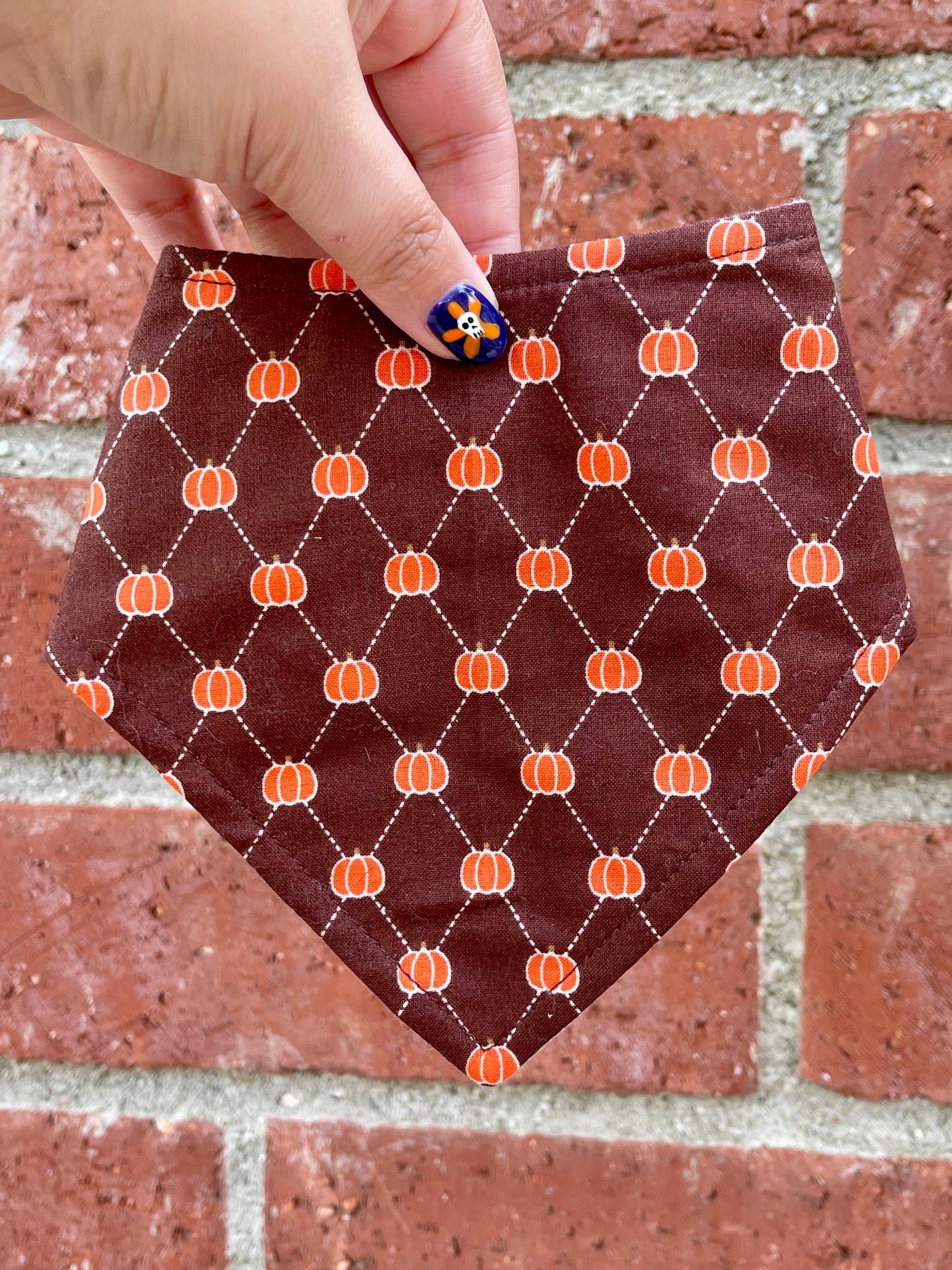 Pumpkin spice meets timeless style! πβ¨ Our Autumn Trellis bandana features a charming lattice of tiny orange pumpkins on a deep cocoa-brown background - the perfect blend of cozy and classic. Whether itβs a stroll through the pumpkin patch, a Thanksgiving dinner, or a leaf-crunching backyard romp, this bandana adds a dash of fall flair to every moment. π