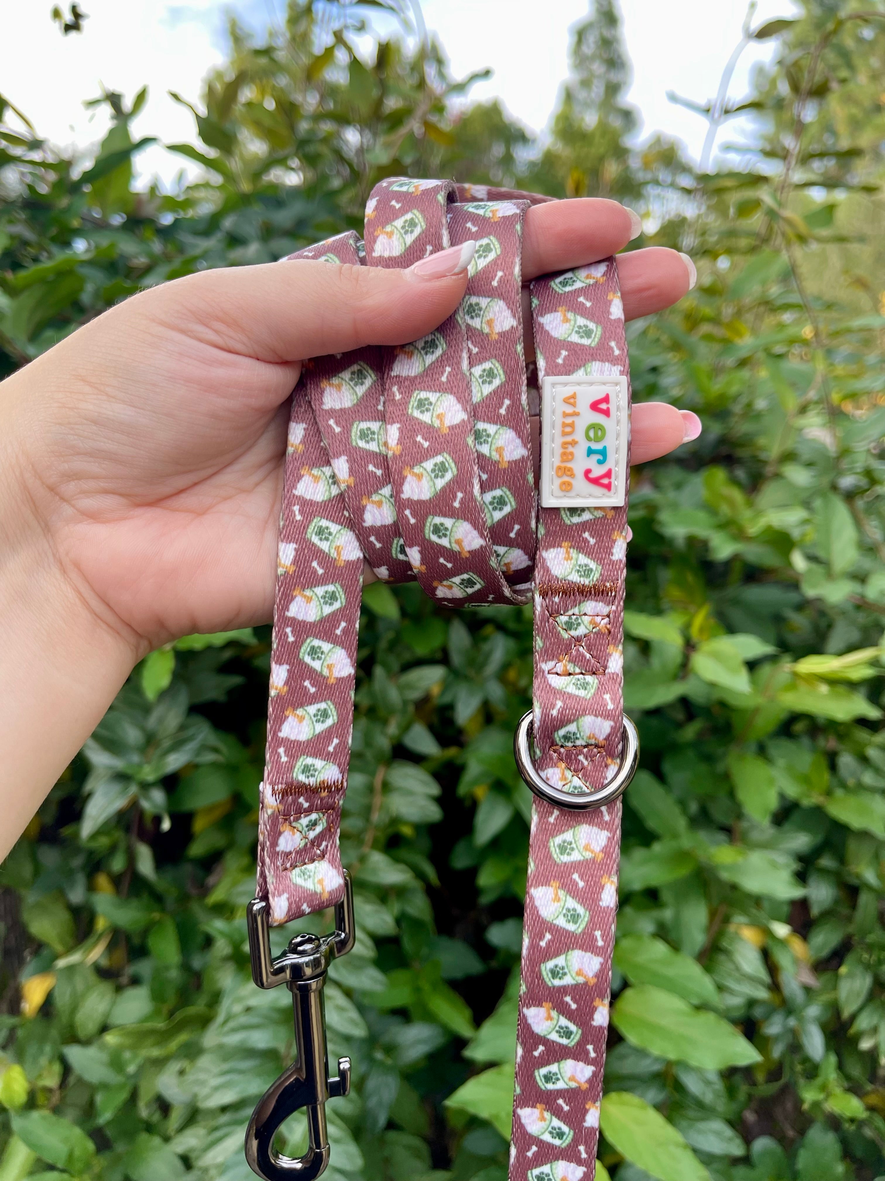 Our Puppachino Dog Leash features an adorable coffee-themed print filled with pup cups, bones, and cozy café vibes - perfect for morning walks, latte dates, and neighborhood strolls with your favorite co-pilot.